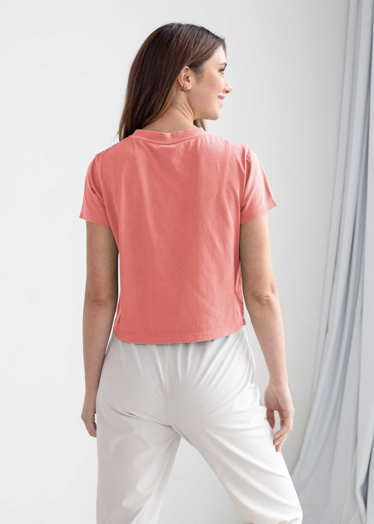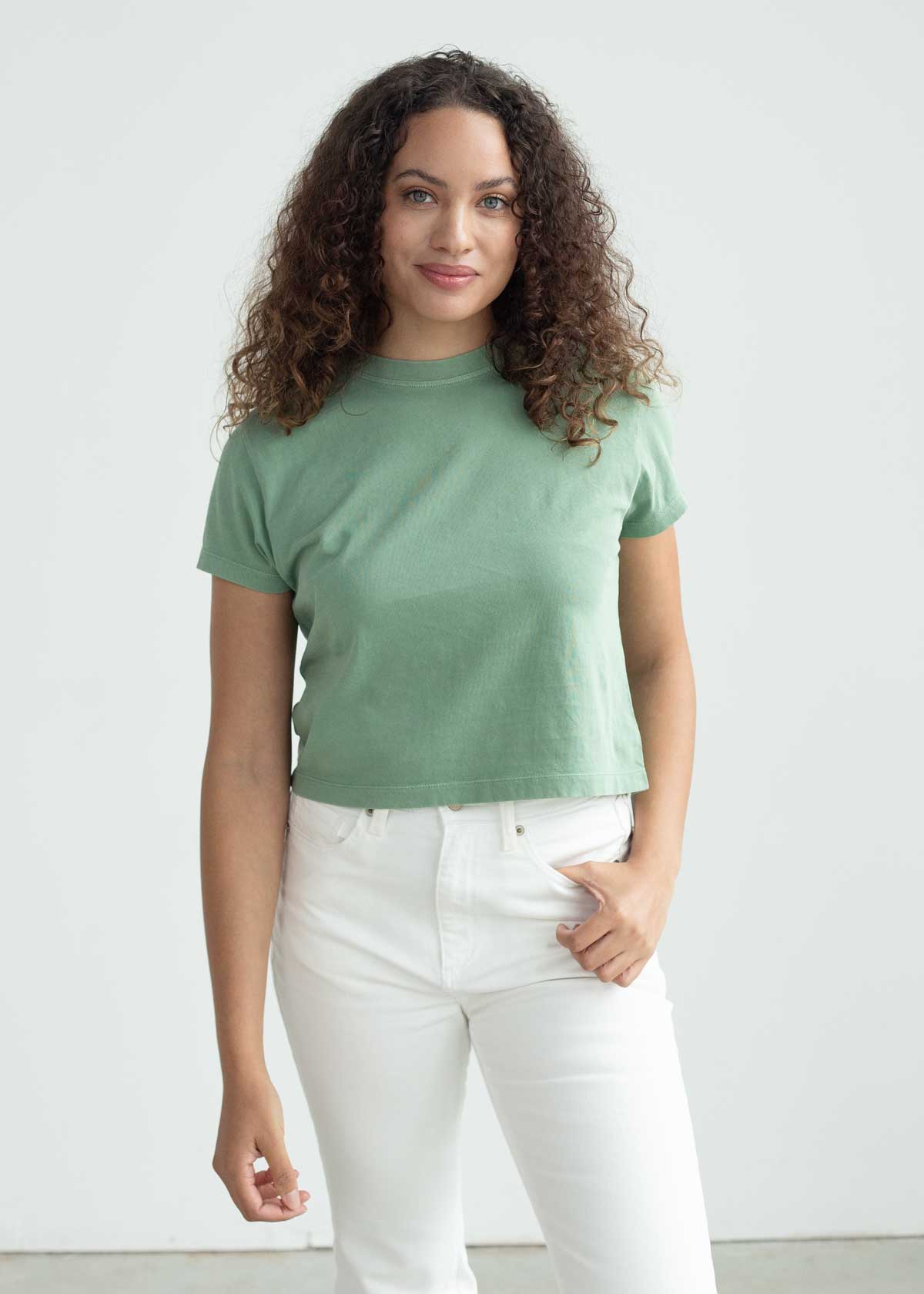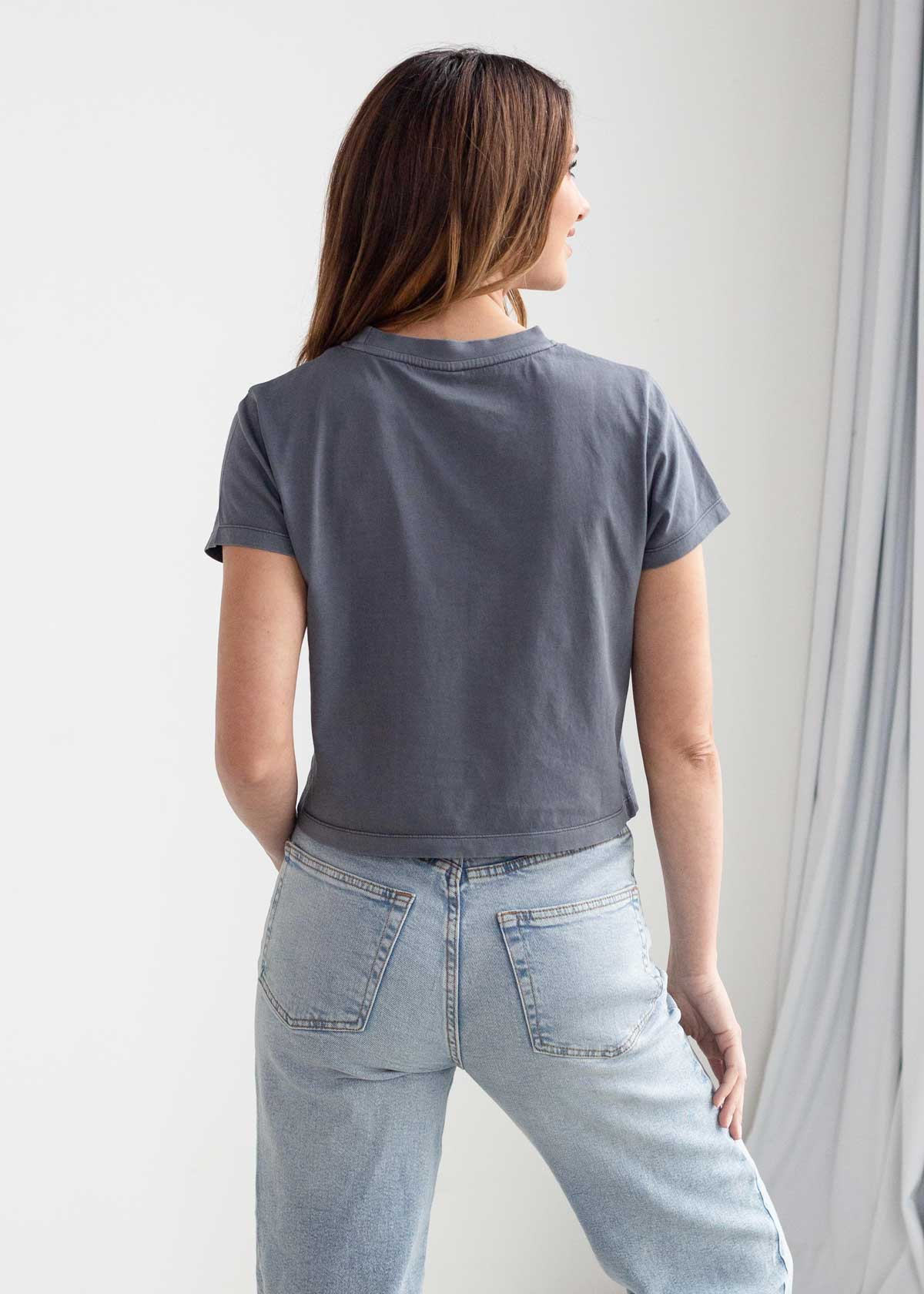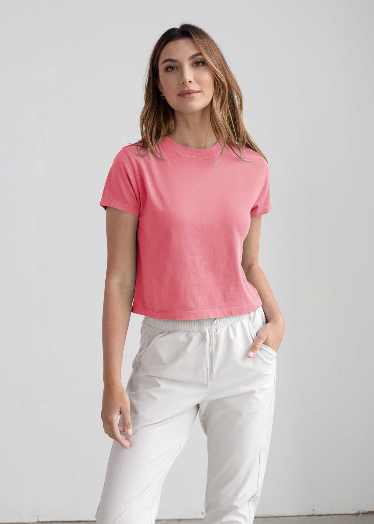Introducing the ultimate throw-on-and-go cropped tee. This effortless crew neck tee is crafted from ultra-soft, lightweight cotton jersey fabric, and finished with a salt wash for that worn-out appearance. With its crop length hitting just below the waist, it's designed to flatter and elevate any outfit. Say hello to your ticket to paradise with The Montauk Tee.